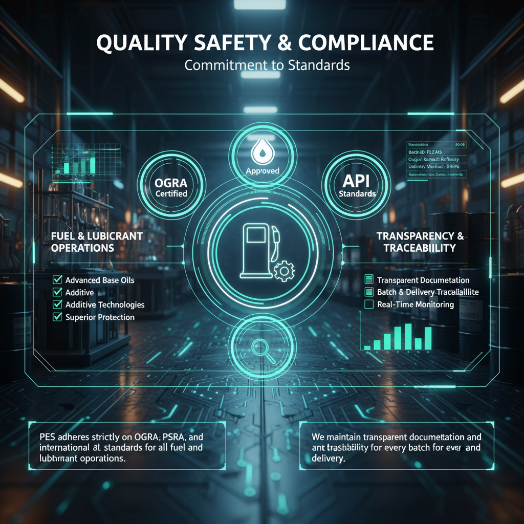 At Pakistan Energy Solutions (PES), we uphold the highest industry standards to ensure safety, quality, and reliability in every operation. Our processes strictly comply with OGRA, PSQCA, and international API standards, guaranteeing excellence across all fuel and lubricant activities.